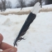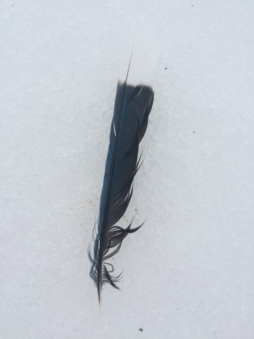 I found this feather, about 6 inches long, underneath a bird feeder this morning. It is a pretty bright blue in some places and then turns to black along the edges, with a white tip that looks like it was dipped in paint! Any ideas who it belongs to?