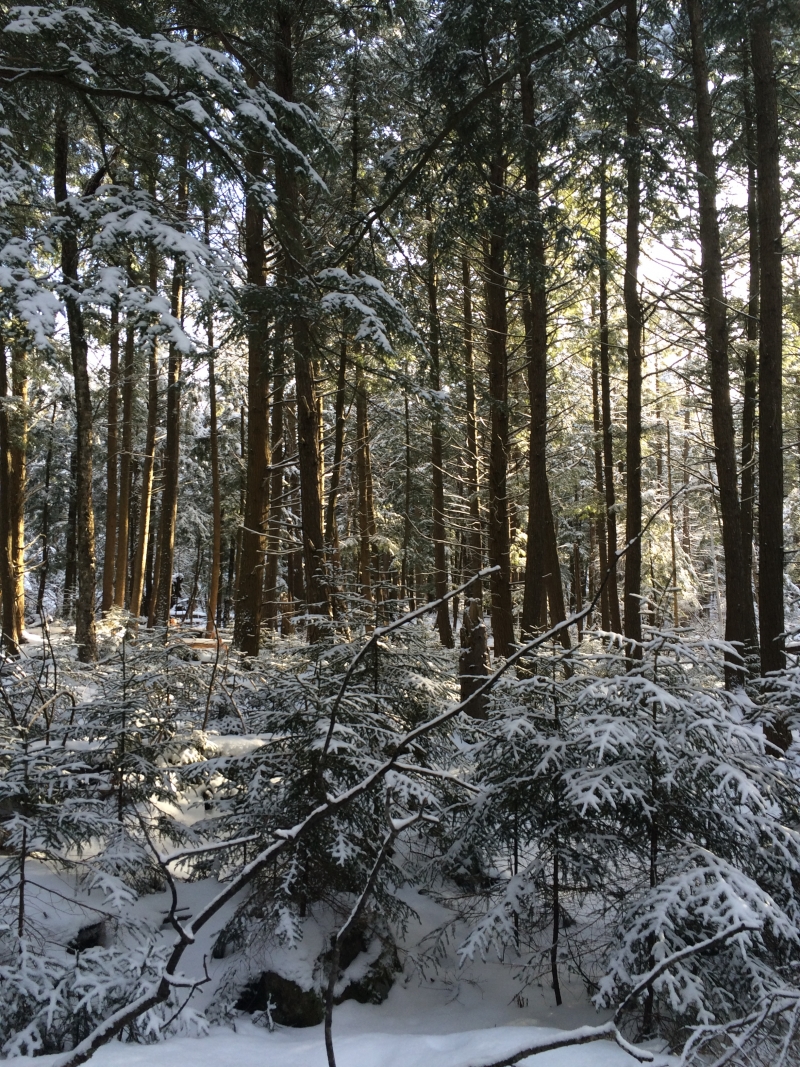 This landscape picture was taken at Higley Flow State Park on a cross country skiing lab field trip. The habitat surrounding this picture was interesting because there were many tall pine trees but at ground level there were many smaller hemlock trees that looked only a few years old. The reason I took this picture was because it looked like there was two totally distinct habitats within this small region. Animals along the lines of birds might use the taller trees on a daily basis, but small rodents or rabbits might inhabit the lower coverage for food and shelter. I also find this picture interesting because it illustrates the point how smaller trees are often times blocked from receiving an efficient amount of sunlight by larger trees having a significant impact on photosynthesis production.