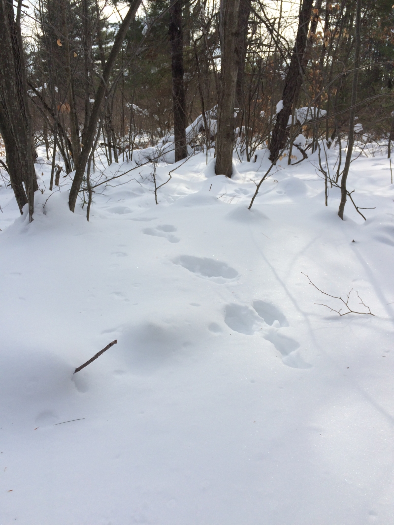 I took this picture of snowshoe hare tracks in Russell, New York. These tracks were weaving through thick brush in a hardwood forest that had many small beech trees nearby. I chose this picture because I thought it was very interesting to see fresh snowshoe hare tracks that were in decent condition and you could really make out the front and hind feet. Many people when looking at these tracks assume that the front tracks are the front legs but in reality they are the hind legs that swing forward when the snowshoe hare runs. Being able to see the huge leaps was really fascinating and really drew me towards this picture.