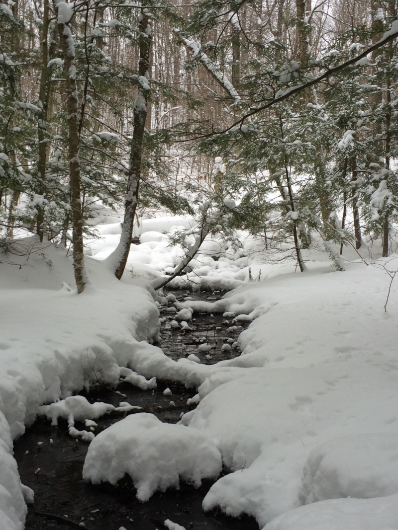 I took this close-up picture on our hike to Stone Valley taken in Colton, New York during a lab field trip. This close-up of a trickling open stream is in a hardwood forest and was surrounded by numerous white pine, ash, and birch trees. This picture captivated my attention because along with the river, this was the only body of water still viewable and unfrozen. It was also interesting because it was moving underneath the accumulated snow layer and if it wasn't for this small open portion of stream, none would have even known it was there.