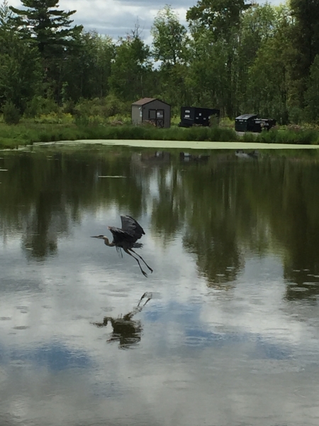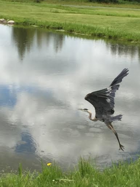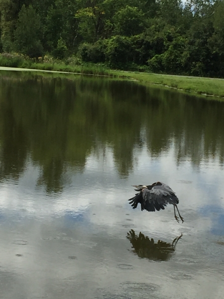 This beautiful great blue heron hangs out at the pond here everyday looking for his next meal. Unfortunately, he doesn't let me get very close to take a picture, so when I came nearby he took off for the other side of the pond.