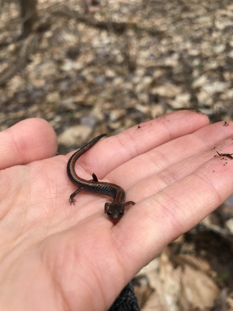 I was out herping and flipping rotting logs when I found this Red-backed salamander under one. The day was about 50 degrees Fahrenheit, but felt a little colder because of cloudiness and a slight breeze. I was on one of the trails at Highley Flow State Park with a bunch of classmates for lab.