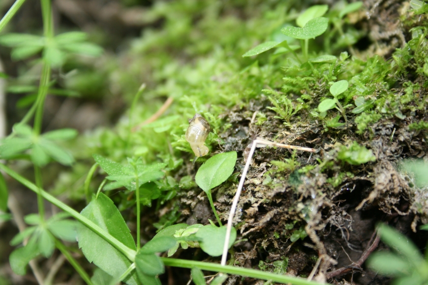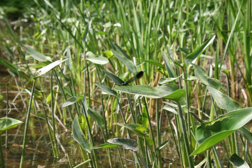 A dragonfly molt, some forget-me-nots, a green frog, a male river jewelwing, and a tiny snail amongst the moss on a summer afternoon river float.