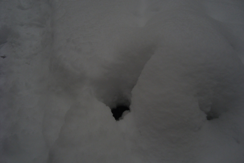 This photo was taken at Stone Valley in Colton. It shows a spot in the snow where a small rodent of some kind would have buried itself. Small rodents, like chipmunks, use the snow cover to burrow into in the winter. Not only does snow make a great insulator for protection from the cold (it contains lots of air) but it also provides protection from potential predators. I took this photo because I spent a good deal of time waiting to see if a chipmunk would emerge, but it was snowing so much the hole was getting covered! The snow was at least three feet deep in some places, so there were plenty of hiding spots for these animals.