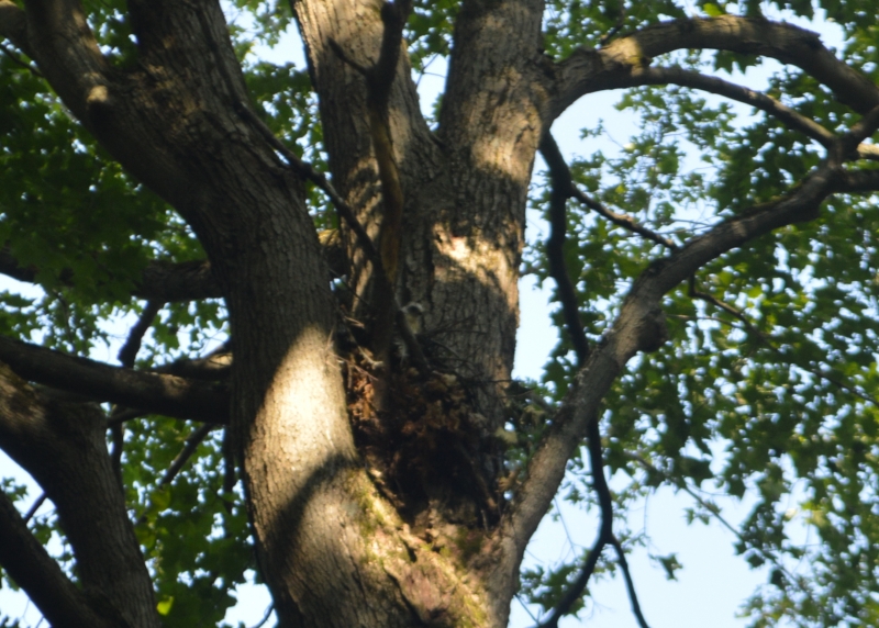 We spotted this baby broadwing hawk in a nest in a sugar maple tree right by the side of the Lowland Trail at the Indian Creek Nature Center. Without a telephoto lens, I wasn't able to get the best picture, but you can see the baby's pale head sticking up out of the nest. They just stared at us the entire time, perfectly still. One of the parents was somewhere nearby, whistling loudly at us. If you notice a sudden concentration of white bird droppings on the ground, look up -- that's how we found this nest!