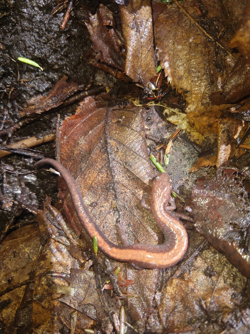 The Herpetology class went exploring in Glenmeal State Forest for lab today, and we found a wide variety of salamanders, frogs, and egg masses. Here's an eastern red-backed salamander (Plethodon cinereus) who was under a mossy log near an intermittent stream. There were actually two red-backs under the same log, within an inch of each other, which is surprising given that this species is usually territorial.