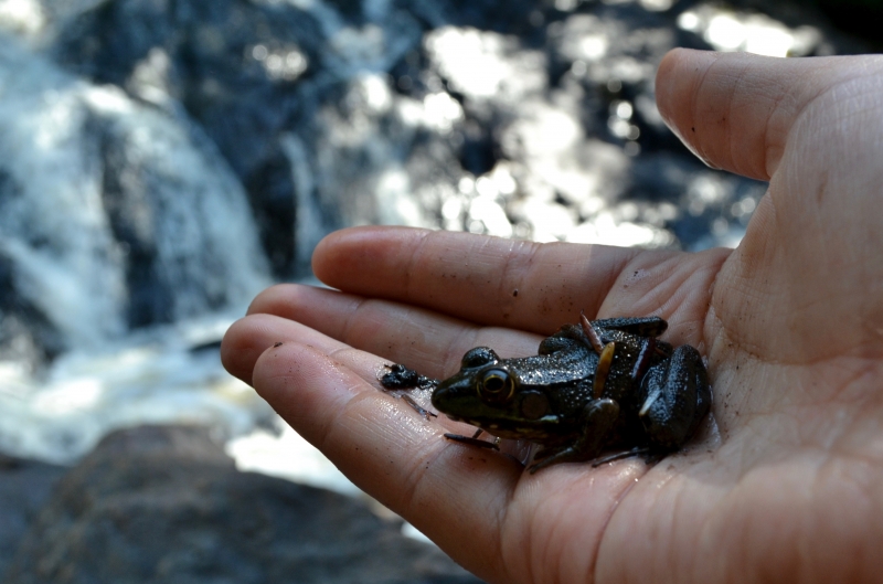 One of my fondest memories as a kid was competing in frog jumping contests. My brother and I would spend hours catching frogs and training them to jump by gently squirting or poking them. We would secretly strategize our frogs of choice, based on size and athleticism, each convinced we knew the formula for a winning frog. I always chose the smallest ones; so much more agile. This past weekend, a few friends and I spent the day at Harper Falls which was hopping with small frogs. I was taken straight back to my childhood and scanned the shallow pools of water for any eyes popping out from the surface. I used to consider myself an Olympic frog-catcher but it seems I am a bit out of practice. I did manage to catch a few little Green Frogs and though I may have lost my magic touch, the joy of catching frogs is just as magical as ever.