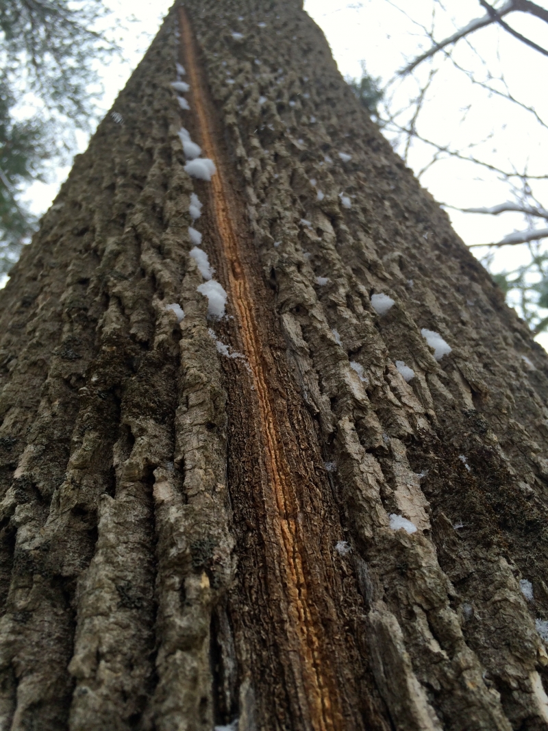 The result is rarely fatal for trees, but does leave a scar. I found it interesting that you can see the color of the tree beneath the inner bark. I like how the angle of the shot draws the eye up the tree.