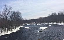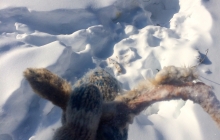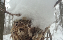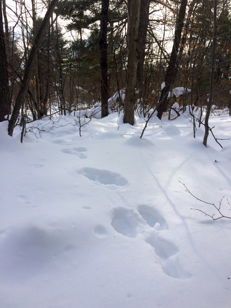 Type: Animal sign. Habitat description: mixed hardwood forest. Natural history information: Snowshoe Hares have a very large surface are on their hind feet, which allows them to stay on top of the snow without sinking in. As a camouflage adaptation, their fur turns white in the winter and a brownish color during the summer. As they move, they plant their smaller front feet and bring their large pack feet in front of them in order to propel their movement. I like this photo because they are very distinctive snowshoe hare tracks based on the size ratio of the front and back feet. It is cool to have evidence of where a hare once romped.