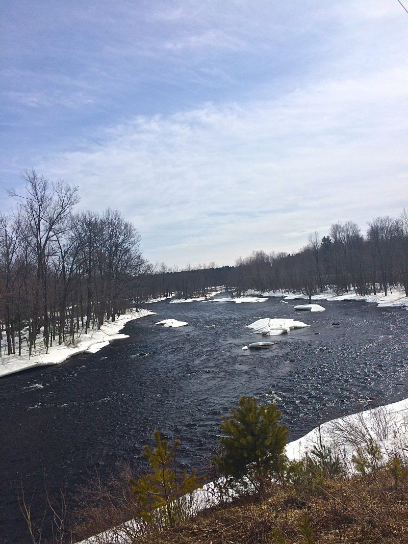 Type: Landscape. Habitat Description: hardwood forrest by a river. Natural History information: The Red Sandstone trail lies along the bank of the Racquet River, south of Potsdam. The trail goes between the Hannawa falls and Sugar Island, both of which are known for their dams. The river is the source of 27 hydroelectric plants. I like this photo because I think the rushing water, melting snow, and small buds beginning to appear, are hopeful signs that spring is on its way.