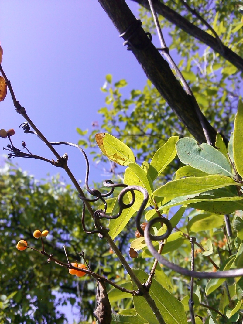 I've always loved vines and tendrils. These little guys seek the sun, holding on to whomever or whatever they can find. The bright orange and blue are just my favorite complementary color combination.