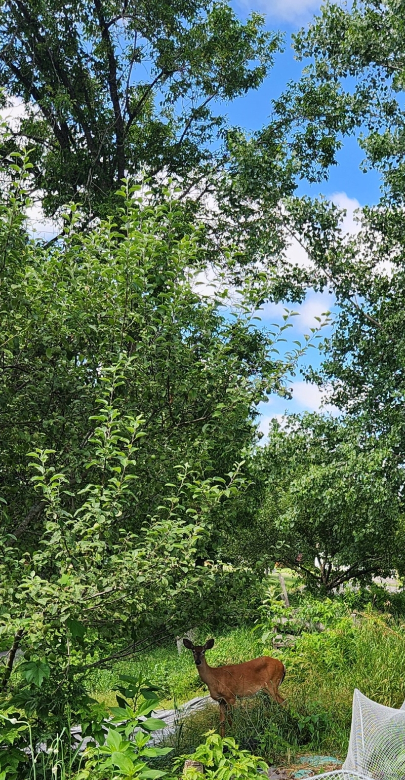 This deer had turned the Permaculture Garden at St. Lawrence University into her home for weeks by the time this picture was taken. She had become a nuisance - ravaging crop left unprotected. On this particular day, she was munching on some apple tree leaves. About a week later, I spotted her hiding in the tall grass in the garden with new twin fawns.