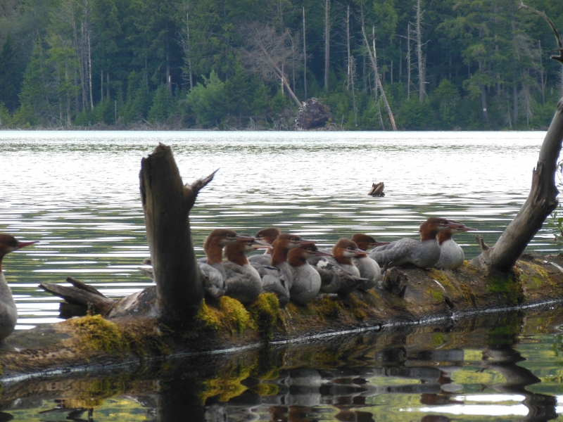 My husband and I were paddling Little Clear Pond in our kayaks when he noticed a family of Mergansers