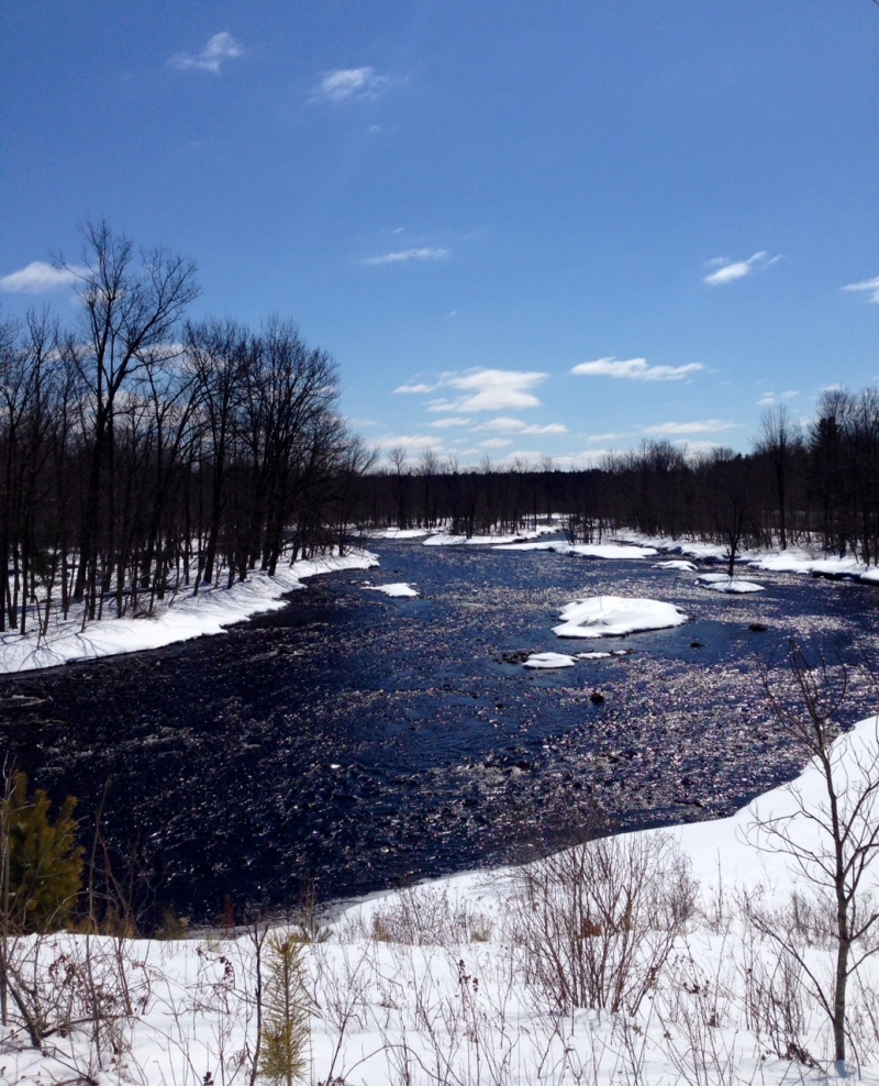 This picture was taken on a beautiful sunny day in Potsdam, NY of part of Indian Creek. Our Natural World class was doing a reflective writing assignment within the wetlands along the creek. Some animals seen that day included red squirrels, crows and black-capped chickadees, who were all chattering up in the Beech, Black Cherry and Maple trees. The area was still quite snowy but small animals tracks (perhaps cottontail rabbit) were seen. Efforts are being made throughout the North Country to maintain the natural beauty of other parts of Indian Creek just like this. I thought the deep blue water looked so clean and striking against the snow and the very clear sky that day. It was so bright and (slightly) warm!