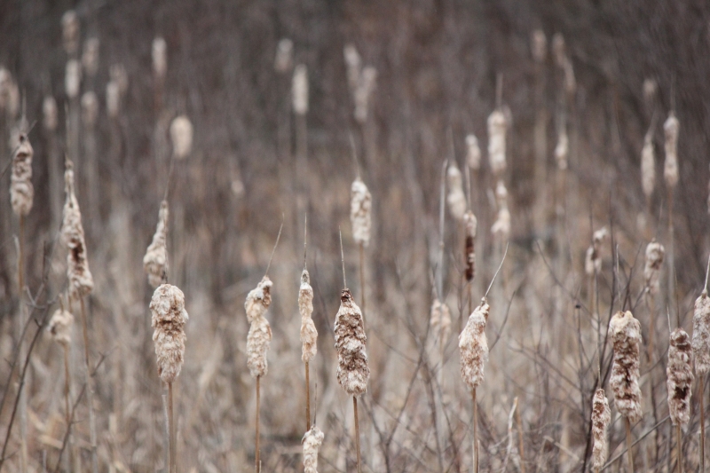 This is a photo of some standing cattails off the side of the road when heading towards Ogdensburg from Canton. They're not growing because it is still cold, but they remained standing throughout the entire winter. Cattails are a wetland plant, most commonly found in large marshes or at the edge of ponds. They can grow as tall as ten feet.