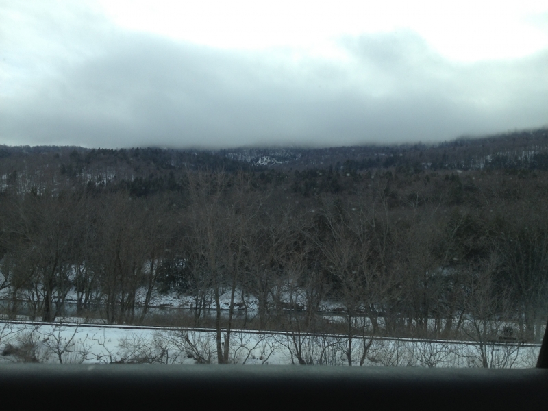Driving along a back road near Canton, NY, baron trees along a river disappear into the fog. Fog occurs when water droplets are trapped close to the surface of the Earth. Technically fog is characterized as a type of stratus cloud, but most people distinguish fog from clouds because it is so low-lying and is usually produced from a local body of water, in this case the river.