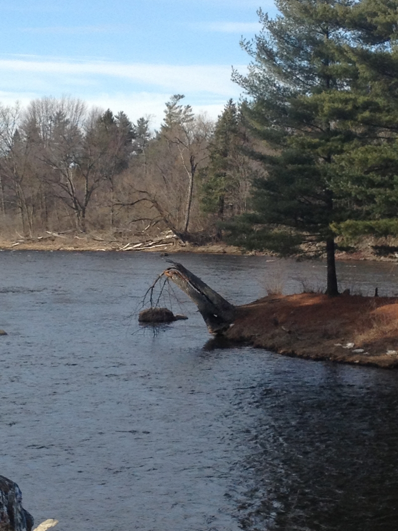 On a brisk, clear afternoon, I observed the pretty view of of a flowing river next to a deciduous forest. A deciduous forest is a sign of a very mature forest. In the beginning stages of succession, smaller leafy plants that require a lot of light and are intolerant of shade. Next, taller woody plants will start to grow, usually conifers are early successive trees. Finally, trees with broader leaves will take over, which are the types of trees in a deciduous forest. This process takes hundreds of years, so this deciduous forest featured in this picture is very mature.