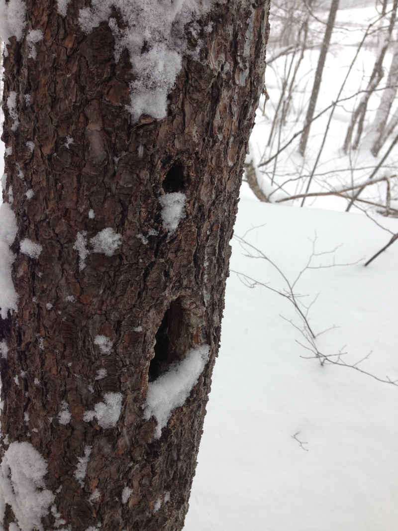 This photo, taken in March at our 'Sugaring' lab at the Cornell Cooperative Exchange depicts an animal sign. The two large holes in the tree are most likely from a woodpecker (species unknown). Here's a question: why exactly to woodpeckers peck? These species of bird are unique in that they like to eat insects that burrow in the bark of trees, such as termites or other borers. They also may raise their young in the bark of trees, so larger holes may indicate so. Contrast to what may be common belief, woodpeckers do not actually eat the wood, they are just trying to get around it. What I find most interesting about this photo is the fact that there are two holes, one slightly larger than the other, right on top of each other. It makes you question what the pecker was looking for -- perhaps it was looking for food, but then decided that this was a good place to raise its young, so it started pecking a much larger hole. Or, it is also possible that it was looking for food, found it, but had a hard time getting to it so it pecked another hole...it will remain a mystery.