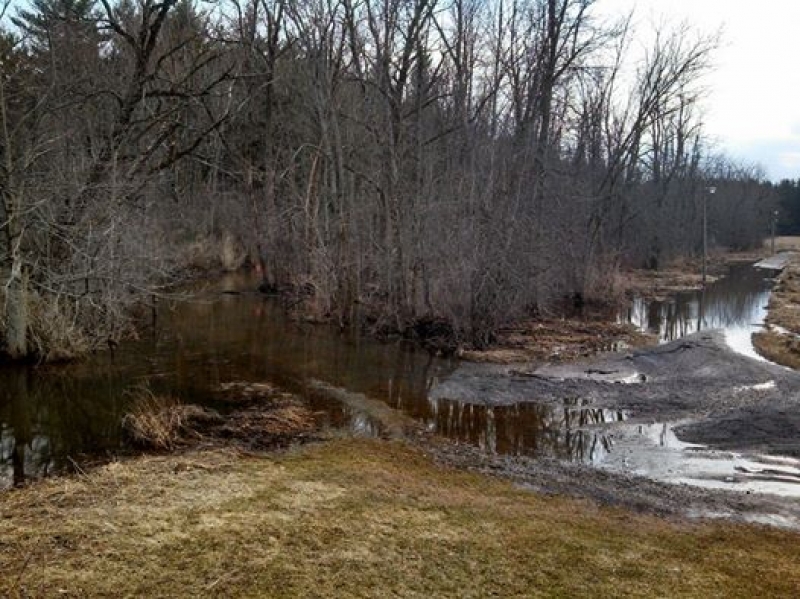 Although it's hard to see, on the left side of this photo is an off-roading trail used by vehicles and on the right side of the photo is a sidewalk. Both the off-roading trail and the sidewalk are right next to the Little River. A week before this photo was taken, there was still some snow on the ground, and the temperatures were cold, and between 20 degrees F and 30 degrees F. Over the past few days, the temperatures had risen between 50 degrees F and 70 degrees F. Due to the drastic change in temperature over a short period of time, there was a change in precipitation from snow to rain, and all of the snow and ice in and around the river had melted. This resulted in the overflowing and flooding of the river into places such as the off-roading trail and the sidewalk which made both of them inaccessible to people.