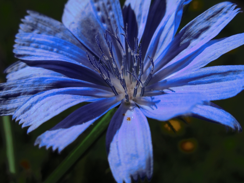 A blue chicory flower. This plant first came to North America with the Old World colonists. As I have researched, it is edible, and the root of the plant contains insulin.