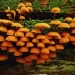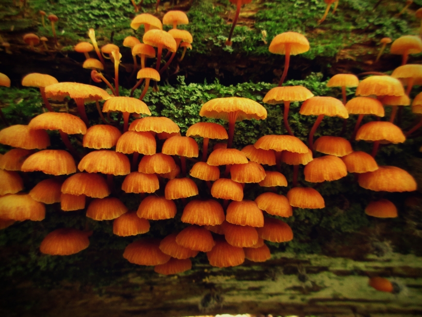 A close-up photo of some orange fungi growing on a fallen tree.