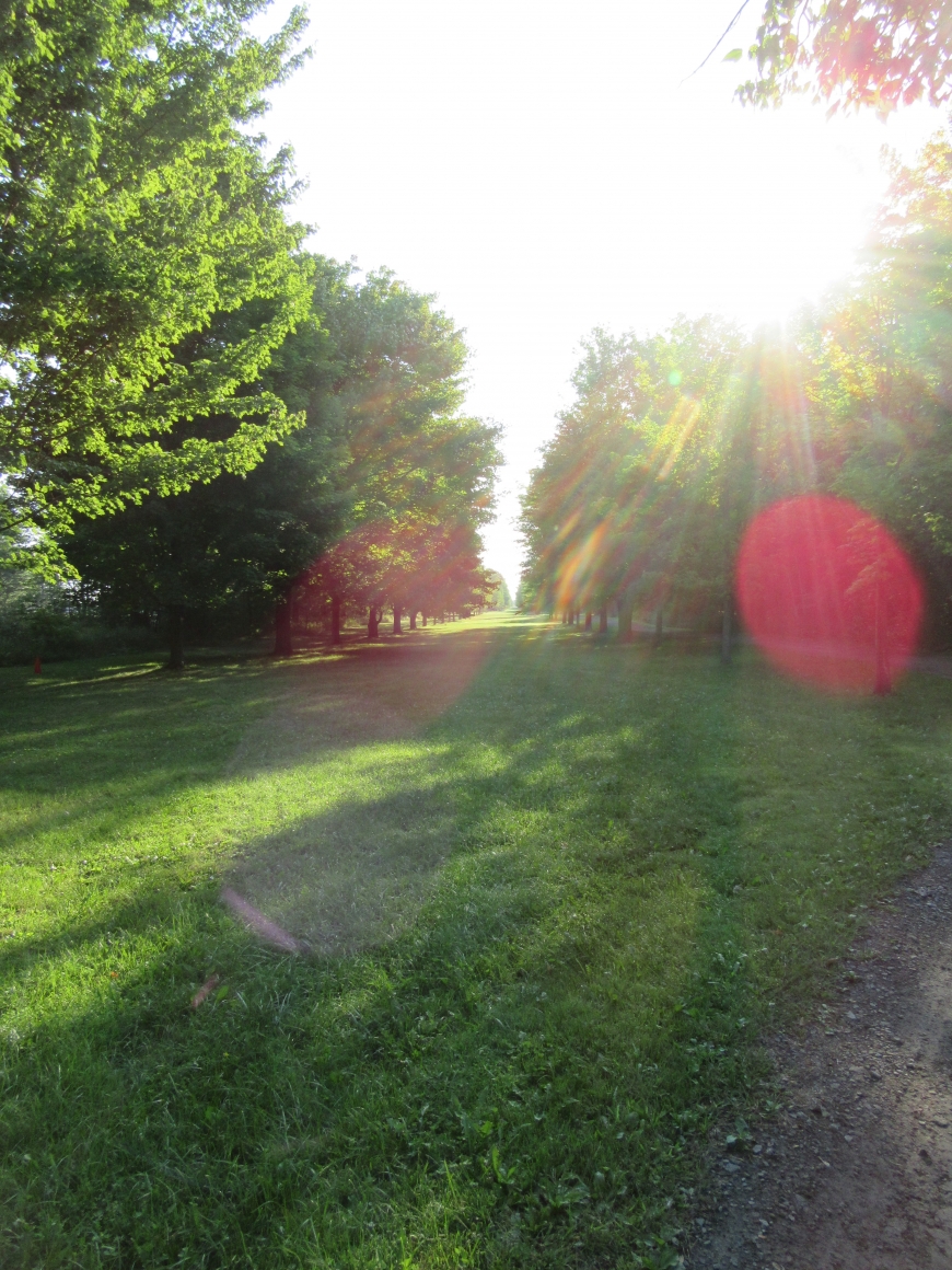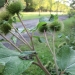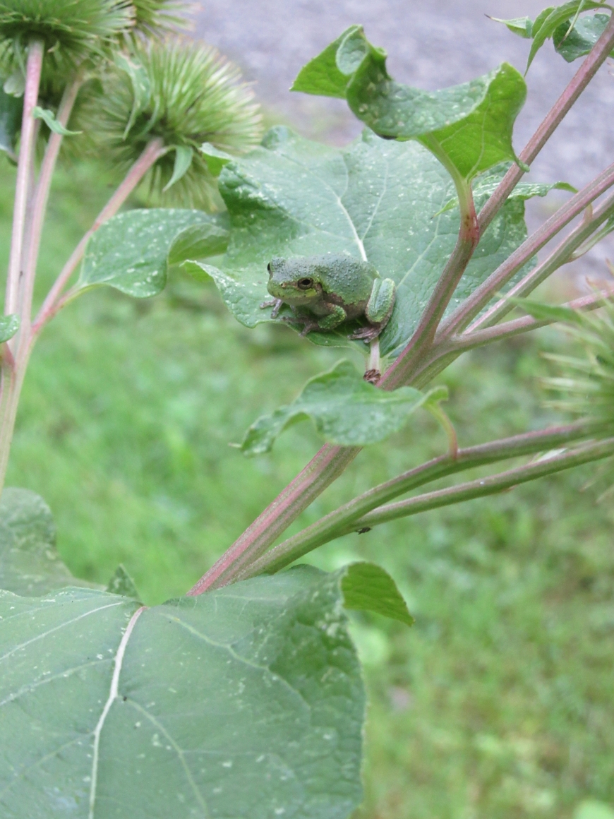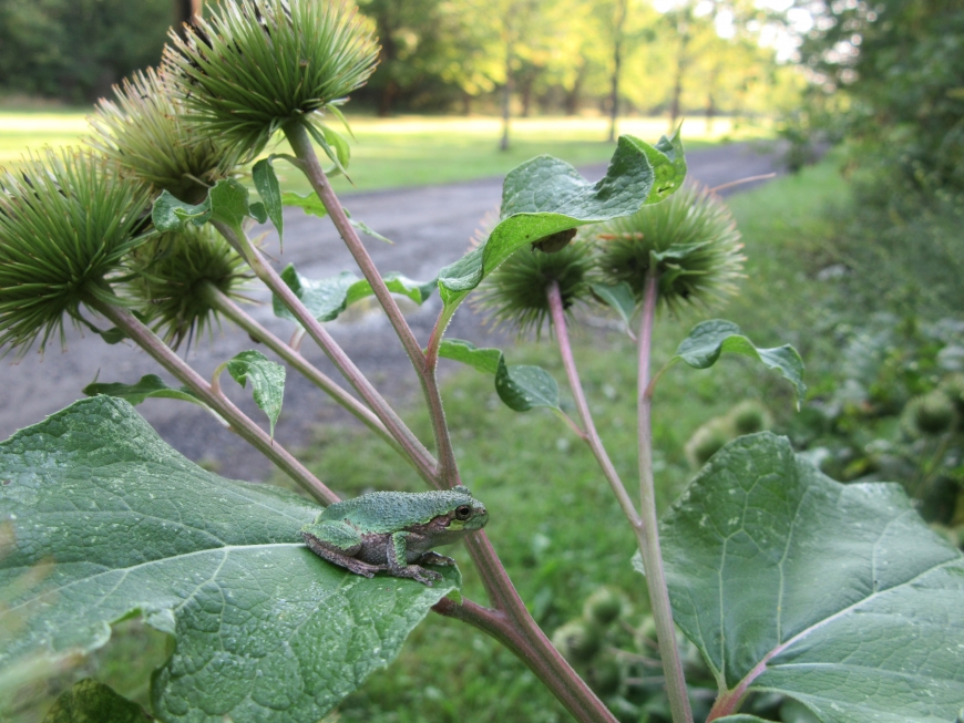 What a privilege it is to not have Friday classes! I went for a morning stroll after a delicious breakfast which took me to Avenue of the Elms. This was the first time in 4 years at St. Lawrence I had not run by without taking a deep breathe and a closer look at the environment. I took note of the beautiful morning sunlight streaming through the trees and the dew on the grass between my toes. I spotted an unusual and unfamiliar spiny plant and went to snap a picture to reference in order to identify the unknown species back in my room. Through the lens, I noticed movement and then, a green little creature looking at me! Gray tree frogs are great at blending into their surroundings. I wonder what else I would notice if I paused from the hustle and bustle of college life! Any ideas what this plant might be?