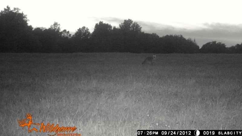 Using a Wildgame Innovations trail cam (Micro Red 6, Enhanced) in the "back 40" a "coywolf" was spotted at 1926hrs on 24SEP12. Distance to coyote is approximately 10 meters, suggesting an overall size of the animal to be much like a full-grown German Shepard. Based on the size and healthy, full coat the animal is possibly the alpha male for a regional pack, which are most active on clear, cool nights.