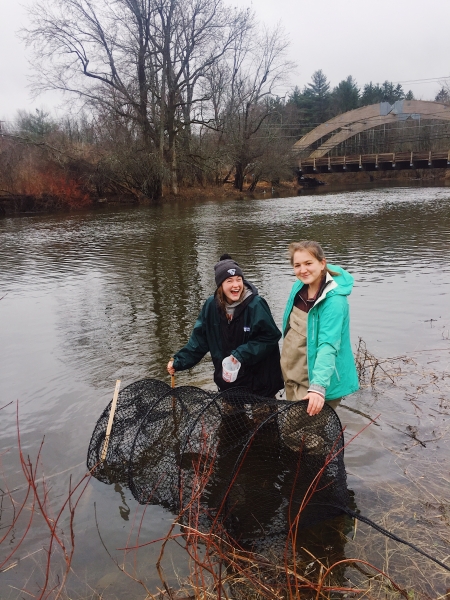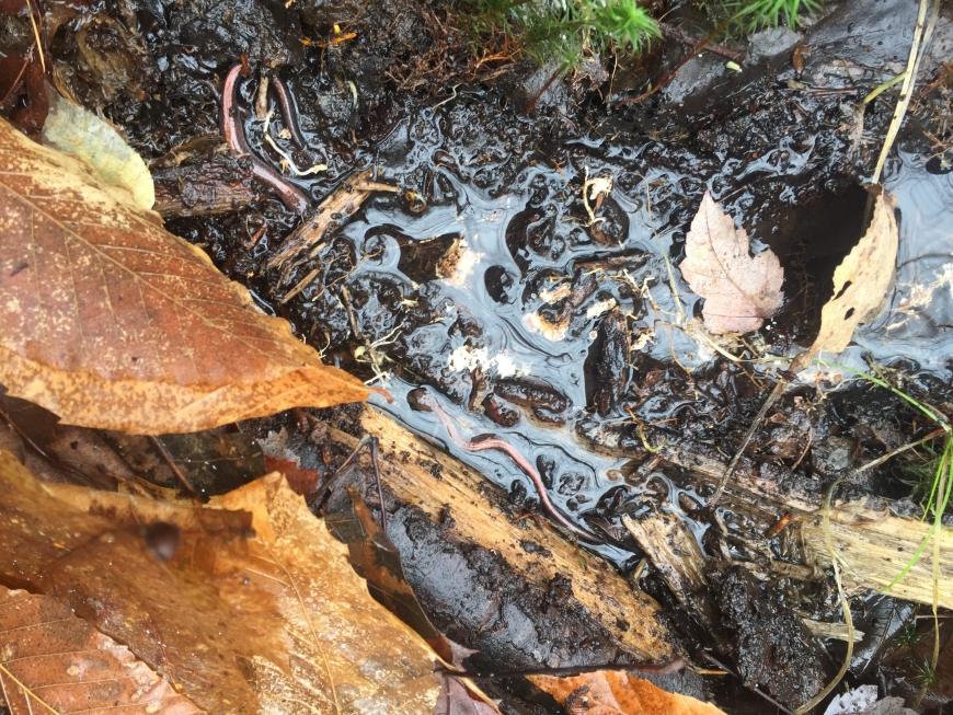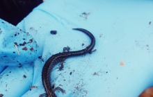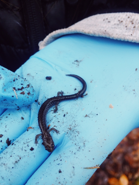 During the Herpetology class's lab period, I spotted two-redbacked salamanders under the same log, one red-backed salamander 5 m from those two, one leadback salamander under a different log, and one red spotted newt under a log. The class collectively heard spring peepers and caught this wood frog in a minnow trap! This all occurred between 1-4 on a rainy and relatively cold, spring day and all herps were found along the Kip Trail near St. Lawrence University. Here are some photos to help!