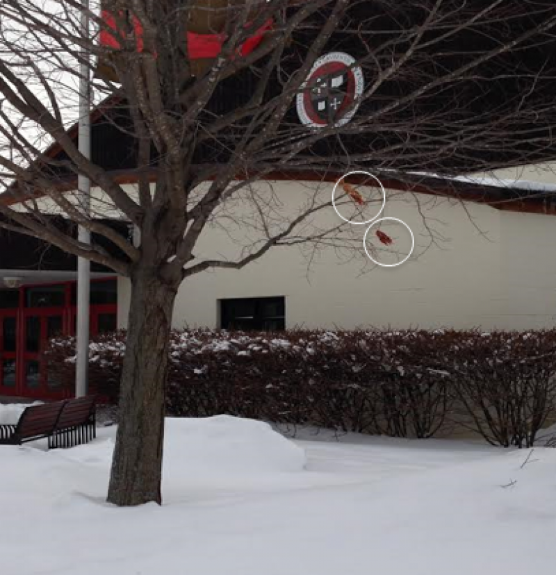 On Saturday, Dec. 21st, 2013 at approximately 1:45 p.m. an ice storm hit Northern New York, directly impacting St. Lawrence County. Almost two inches of ice had accumulated the next day, only getting worse as more snow came and temperatures began to drop. The winds and large amount of ice knocked down power lines, leaving citizens powerless for the following two weeks and some longer. Many trees, such as this maple, were left naked because the ice weighed down the leaves and caused limbs to break. However, this particular maple tree was left with these two brown-colored leaves. This implies that these leaves were there since the fall time, and were present up until the ice storm hit. These leaves do not always fall in the winter but they do curl up, and the tree might force them to fall if it is completely healthy. Some maples retain their dead leaves to slow down the wind and protect their buds from insects. Other maples retain their dead leaves only on branches that have a verticillium-related disease. There’s a possibility that this maple did not shed these two leaves, despite the harsh winds and ice, because they’re both located on a diseased branch, which is holding on to the leaves until it recovers.