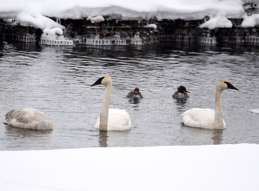 I got some quick pictures of some of the swans and merganser that have been residing there for the past month or so.