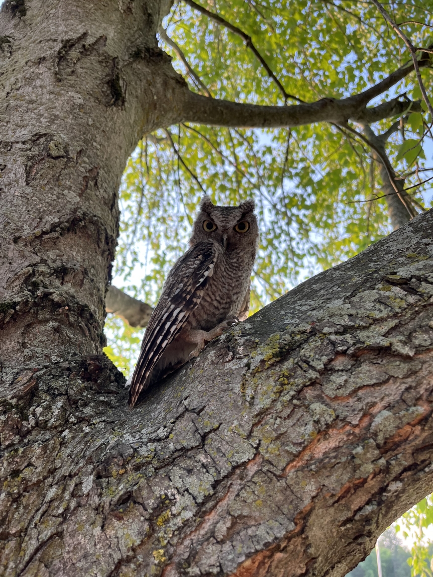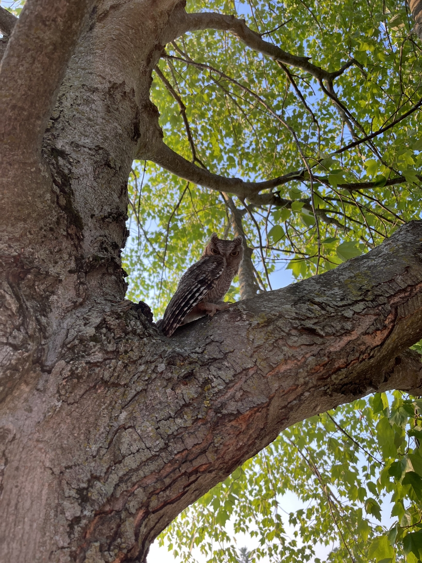 A baby great horned owl was moved from the grates in front of Newell Field House and into a nearby tree. This bird has just fledged from the nest, as it's too big to stay there, and can now start learning to fly. The owl's parents leave it hidden during the day and then return at night to feed the owl!