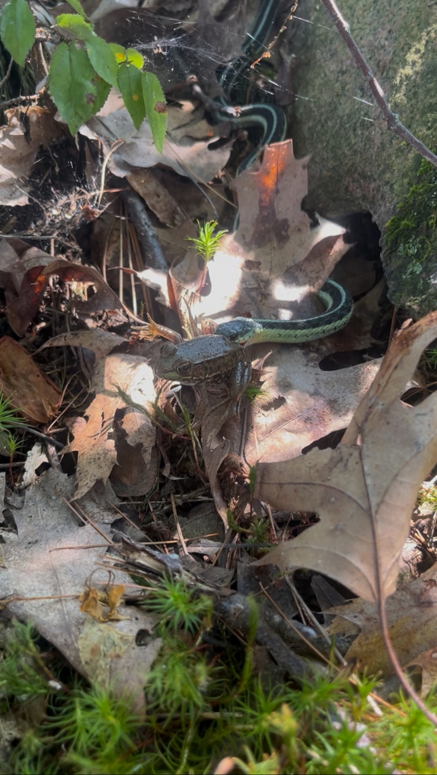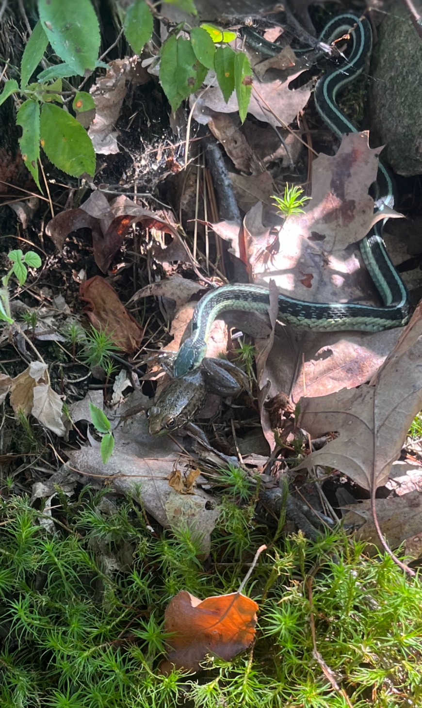 A common ribbon snake caught a grey frog, and the frog was fighting for its life. However, it did not escape.