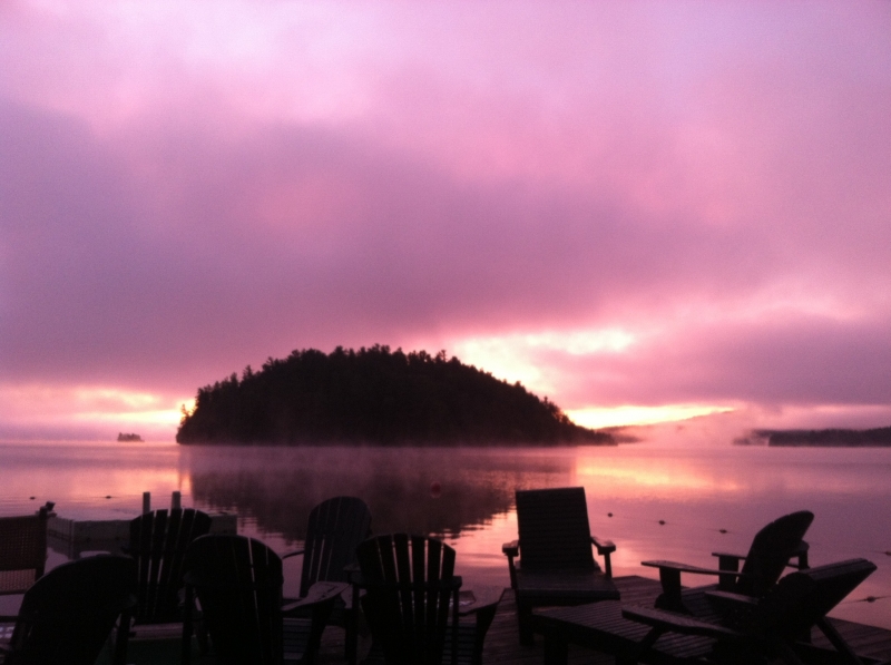 A beautiful sunrise with a purple sky. The clouds covered the island as the sun came peaking over the trees. This was at about 5:30 AM. I was sleeping on a dock at Camp Canaras in Saranac Lake, New York when I was leading a pre-trip.