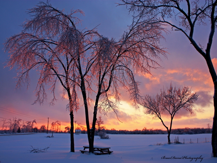 Glistening,dazzling,shimmering!! Dangerous!! Slippery!! It started just a couple of days before Christmas in 2013.Many roads were closed and travel bans were implemented.Then the icing stopped, the roads were opened and the skies cleared and the sun was gleaming on all that ice coating everything. Trees,shrubs, fencerows, powerlines.Everything was transformed into a picture perfect Christmas Card scene.The ice continued to adorn the landscape for several days after Christmas because despite the welcome sunshine it was cold enough not to melt the ice for days.After a few days it did melt off the branches and powerlines.