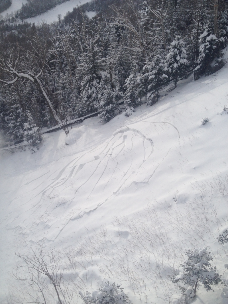I thought this picture was cool because it looks like a slow moving avalanche. This shows movement but while I was passing it, it did not move. The way this forms by the guns that blast snow. The snow accumulated on this one spot and the ice moved down due to gravity