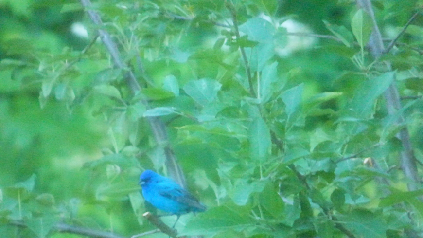 This beautiful bird was seen only twice. Once by Bill and once by Janet from our screen room. It was perched in a bushy tree by our hedgerow. We could not believe our eyes. The blue was so brilliant. It stayed for a short time. Song was a dry sharp spik.