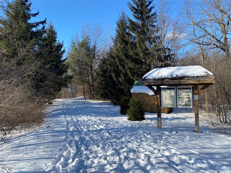 The parking lot is not plowed in the winter, so park in the lots next to Main Street if you'd like to come! Traction devices are heavily recommended! The trail is packed and frozen from foot traffic.