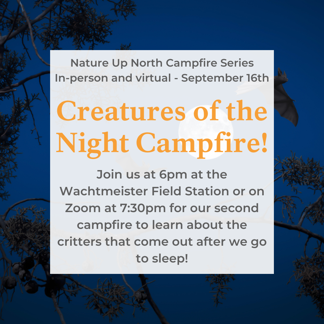 And if you can't make it to our in-person campfire, have no fear! We'll be holding a virtual Creatures of the Night campfire at 7:30! Register here for the Zoom link: https://www.natureupnorth.org/form/creatures-of-the-night-virtual-c