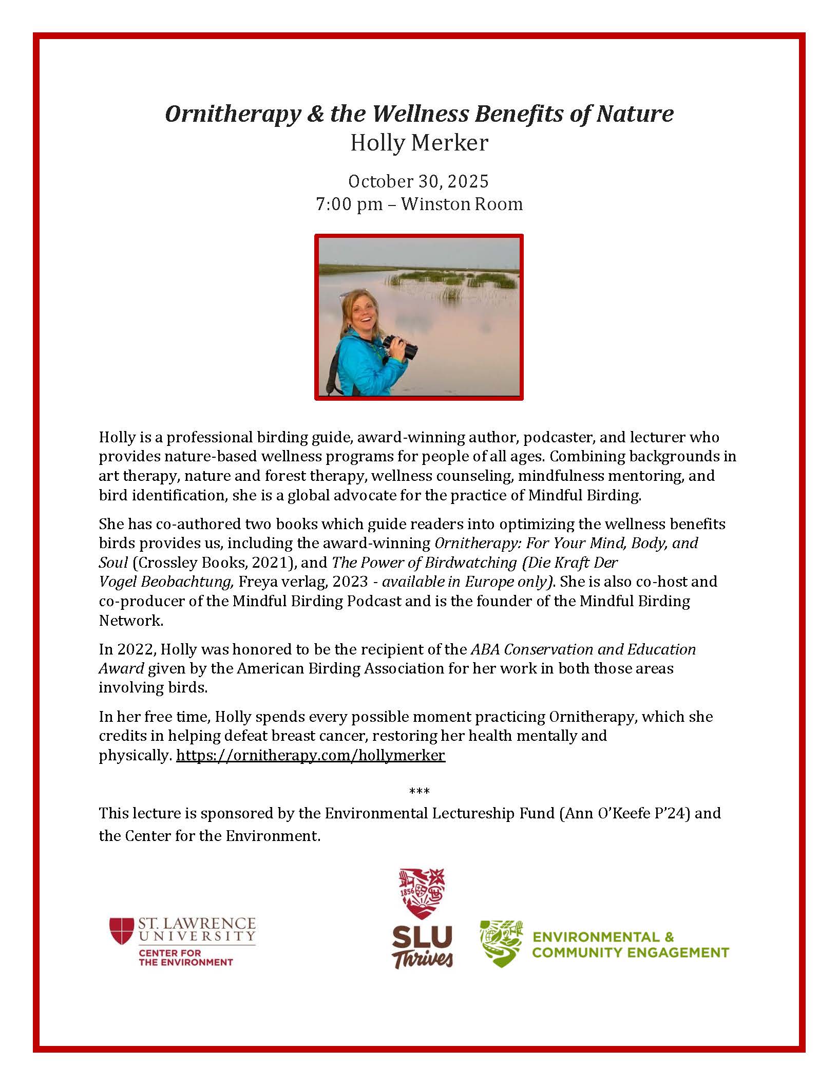 This event is sponsored by the Center for the Environment with generous support from the Environmental Lectureship Fund established by Ann O’Keefe (P’24). The theme of the lecture ties in nicely with the SLU Thrives initiative.
