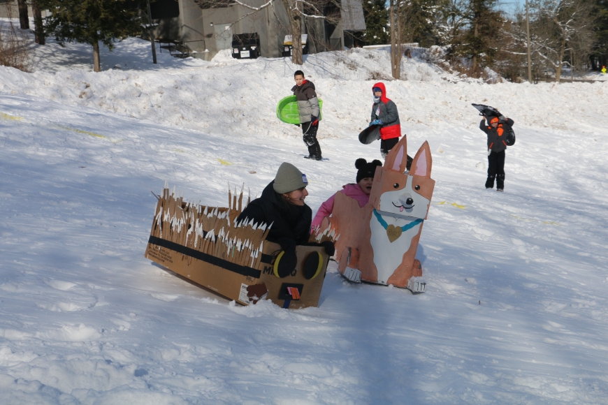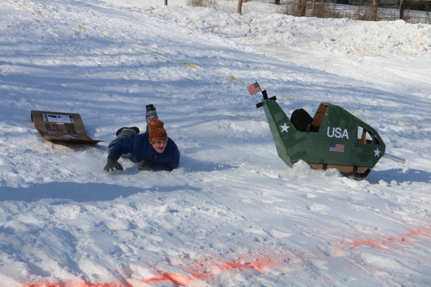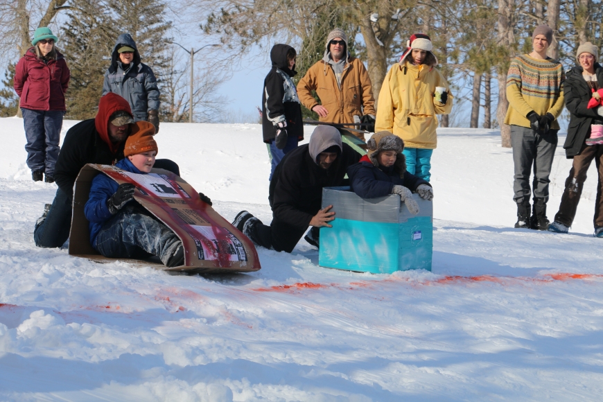 The 7th Annual Cardboard Sled Race this past Saturday, February 8th was better than we could have hoped and a great way to kick off Canton's Winterfest! It was a balmy 25 degrees and sunny morning, perfect for speeding down SUNY Canton's sledding hill. Competition was fierce, with many racers fighting their way to the finish line by dragging, flipping, rolling, or getting a boost in their sled from a teammate. Participants competed 1 v. 1 against each other, and then against Nature Up North's sleds to see who was the fastest.