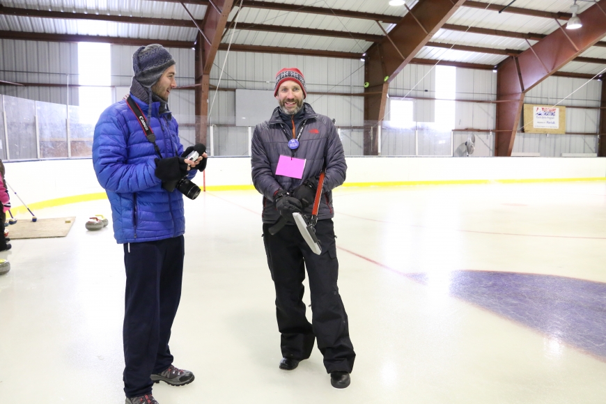 Justin talking to curling volunteer Brian. Photo: Jane Eifert