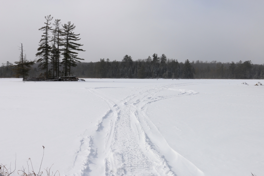 Snowmobile Tracks on Cranberry Lake. Photo: Justin Dalaba