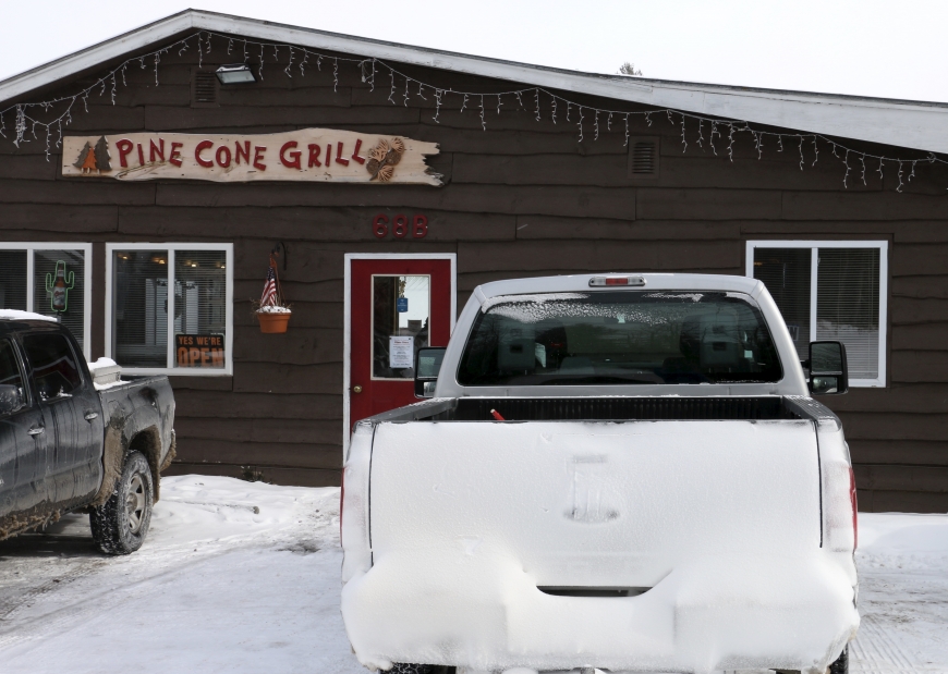 Third stop: Wanakena. When we arrived at the Pine Cone Grill, the Co-Owner, Suzie, informed us that the ice bowling, frying pan toss and snowmobile trivia fun run had all been cancelled due to the wind chill and trail conditions. Without asking, she began to tell us what she thinks this event means for the local communities, stating that “there’s not a lot going on in the area; there’s not a lot of industry and we get most of our traffic from snowmobilers, so we need more tourism events like this.” She went on to tell us that they have had up to 70 sleds parked along the lake before. The Pine Cone Grill also sits directly across the lake from trails to the Big Pine, an old-growth white pine tree estimated to be at least 300 years old. The hike to the tree is an attraction for snowshoers during the Whiteout Weekend as well. The Pine Cone Grill is just one of the many local restaurants and businesses in the area that partner with this event to help the local economy.