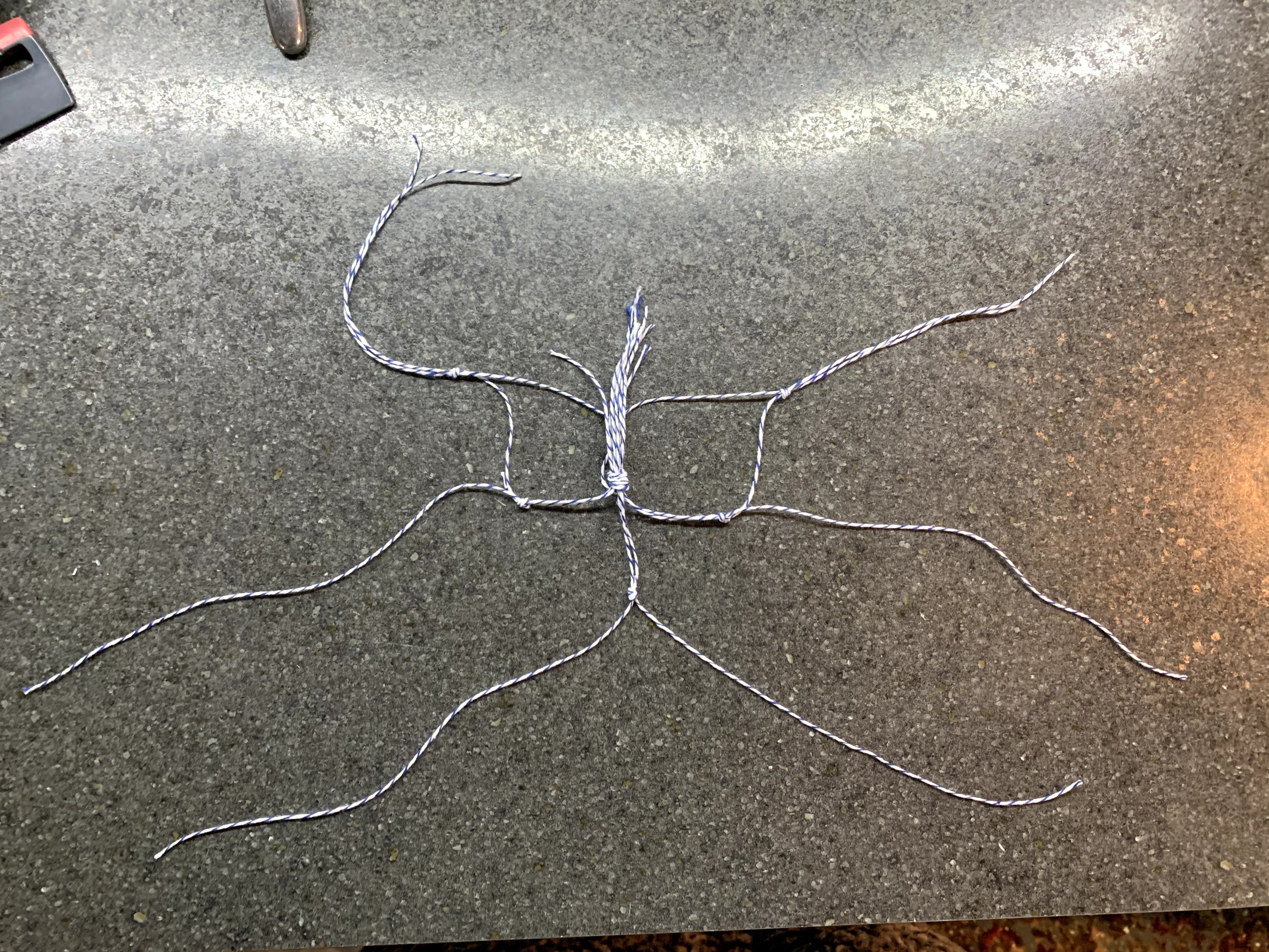 - Measure out eight strings, each about 12” to 18” long. Tie them all together leaving about an inch above the knot.