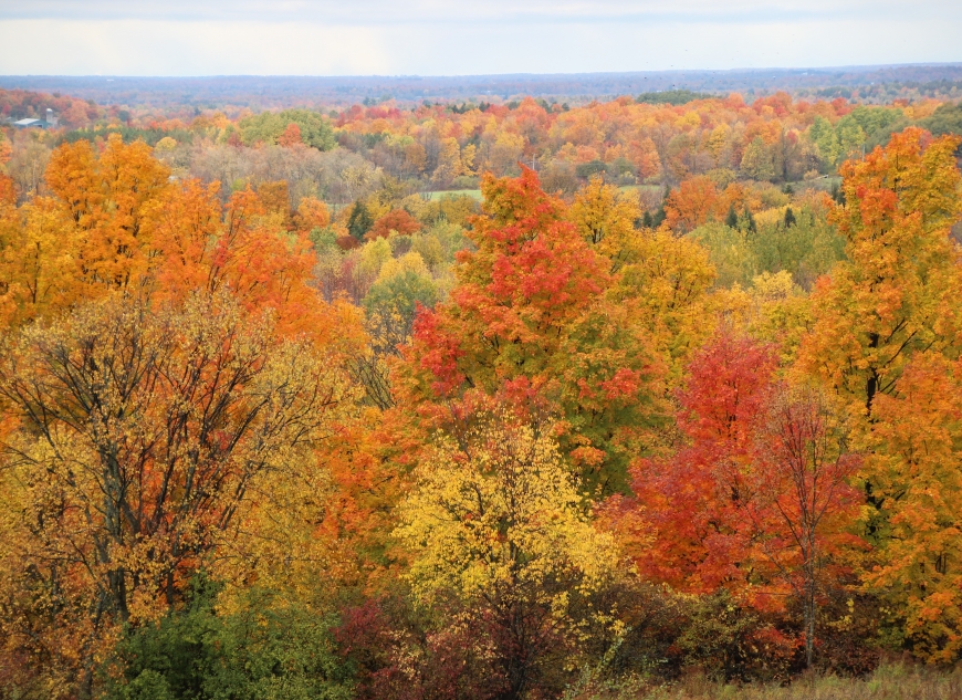 It’s not like yellow and orange are just randomly painted on the insides of leaves, though. Molecules other than chlorophyll are involved in various metabolic pathways within a leaf, and they happen to be colorful. By comparison, we are boring. Our hemoglobin is red, at least in the presence of oxygen, but we are not as flamboyant on a cellular level as leaves are.