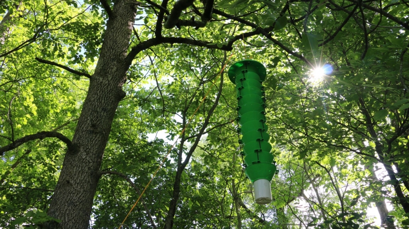 Traps like this one in Canton hang on ash trees across St. Lawrence County as part of an effort to monitor the spread of EAB. Photo: Jess LaMay.