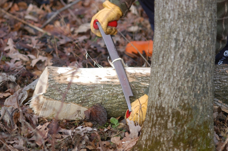 After EAB emergence is over, usually in late fall, the trap tree is felled, limbed, and placed up on sawhorses. Using a sharp draw-knife, the bark of the entire trunk is carefully peeled to look for emerald ash borer galleries and larvae.