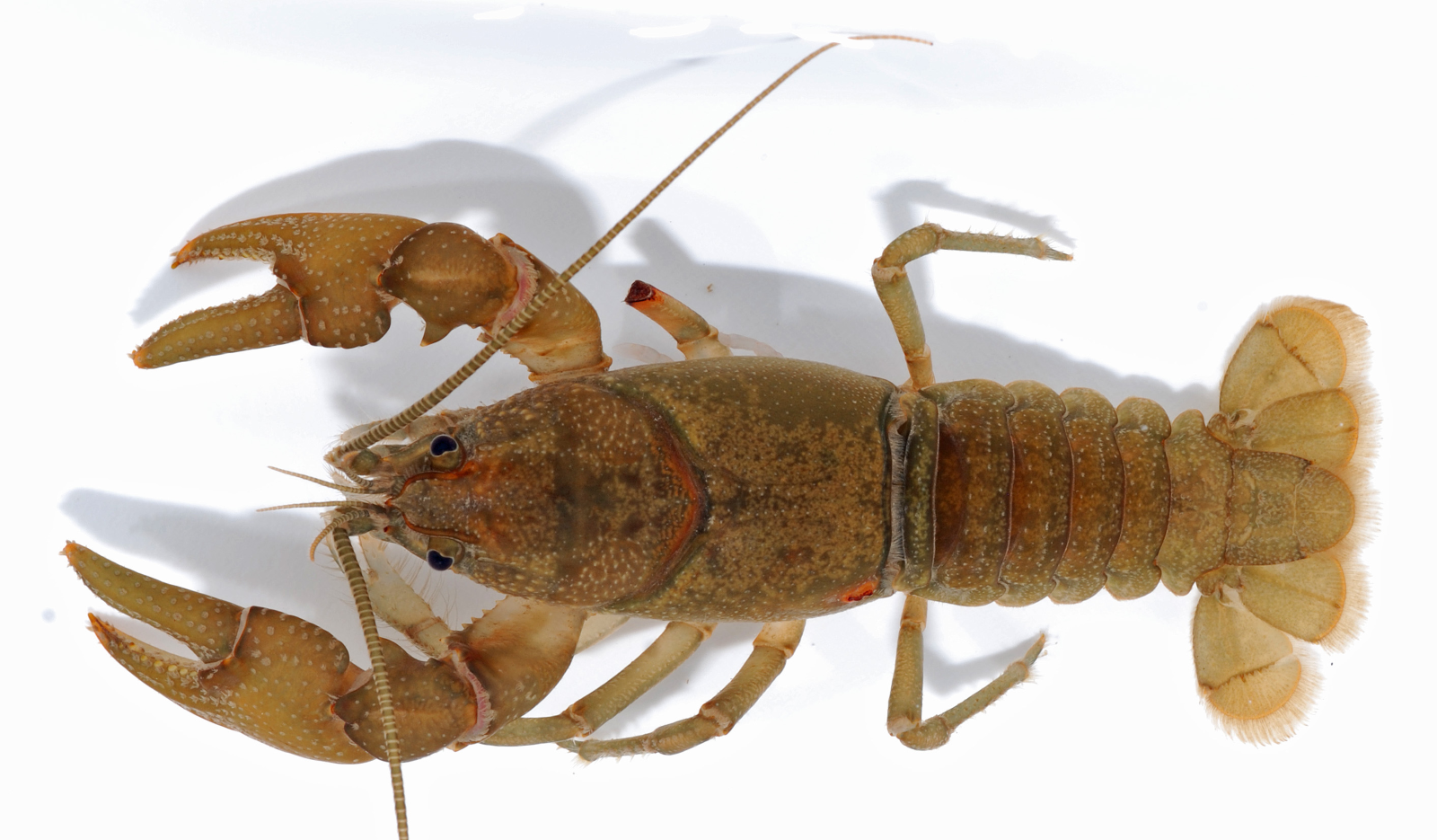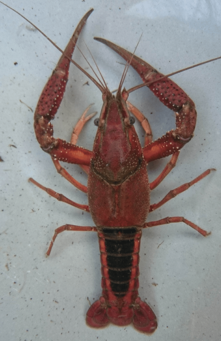 White River Crayfish tend to have Dark Red bodies with a Wedge-shaped Black marking along the tail, but smaller ones can be brown and spotted. Another giveaway is the long narrow shape of their claws, which is distinct from the shorter and fatter claws seen on the other species in the North Country. They also will burrow during dry summer or fall seasons, so check for hills along the shoreline. (USGS White River)
