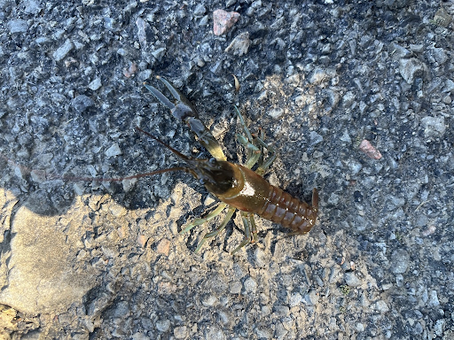 There are two methods I employ in finding wild crayfish, and both have their time and place. It’s best to start by observing passively. One spot I would recommend is the boat launch at Eel Weir State Park. From shore or a few feet away in the water, watch over a clear, rocky, fast-moving spot. Just the other day I saw over five crayfish perched on top of a rock using this method! If you can't find any in the open, then go into their habitat and begin searching by flipping rocks and logs. This method is often necessary to find crayfish, but has the drawback of clouding the water which can hamper your ability to spot them. Once you see a crayfish you can catch it by approaching it from the rear and picking it up from behind the claws. Try to get a secure grip, but make sure you don't injure the crayfish. When you are ready to release the crayfish, simply place it back in the water or the shore near where you found it. While crayfish can survive a long time out of water as long as its gills are wet, it's still best to return them to the water, if that's where you found them.