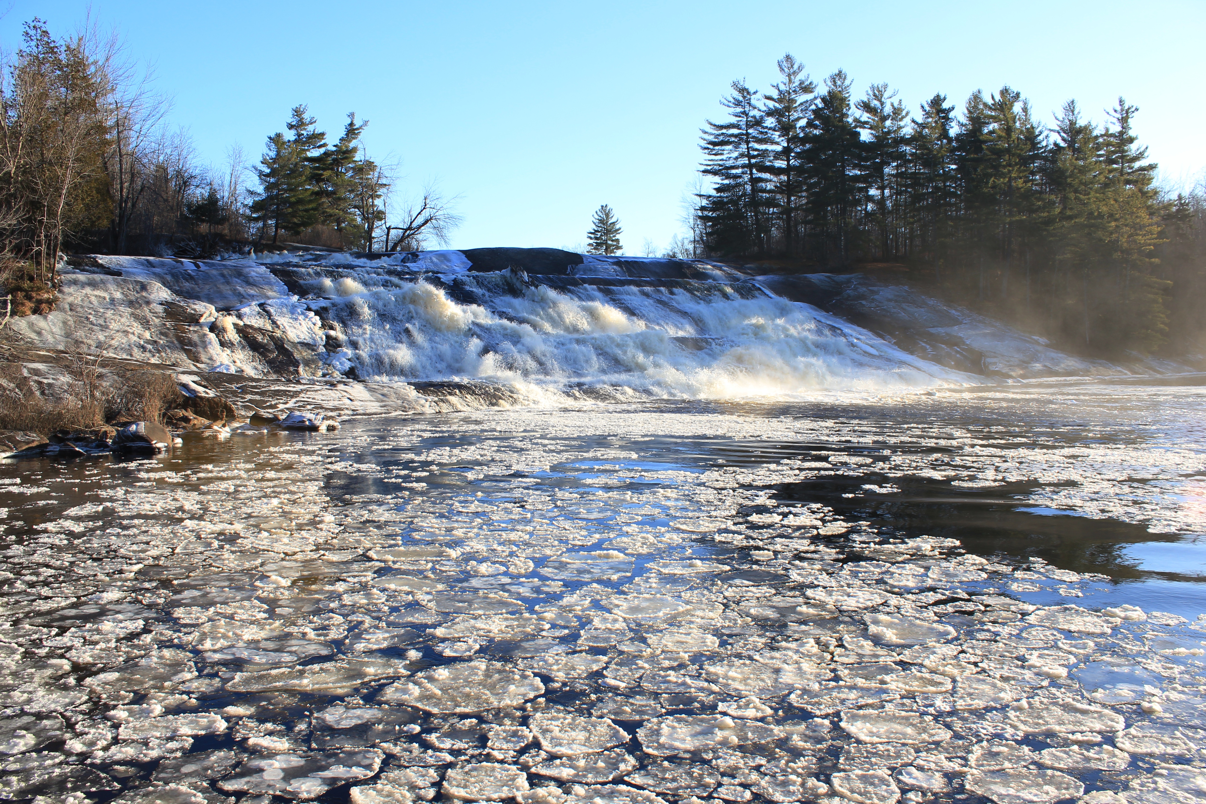 The Lampson Falls Trail provides relatively easy access to one of the largest and most popular waterfalls in the North Country. These impressive falls drop 100 feet over a smooth rock face into a large, swirling pool at the bottom. Down the trail from the falls, there is a small beach area with safe swimming in an eddy on river right. The trail to the falls is wide, flat, and accommodates wheel chairs. From the top of the falls, the trail narrows and drops steeply down to the beach, then continues over a rocky outcrop opposite the waterfall. In summer, many people stop here to pick blueberries, sunbathe, and admire the falls from the rocks. To complete the loop, look for yellow trail markers on the trees that will lead you on a path along the river. This section can be overgrown in the summer, but offers a scenic views of the Grasse. After about a mile of walking along the river, near the remnants of an old bridge, the trail turns right and continues gradually uphill on an old forest road. It eventually links into the main trail just above the falls. Parking is available along Rte. 27 year-round, and the trail system is popular with skiers and snowshoers in winter.